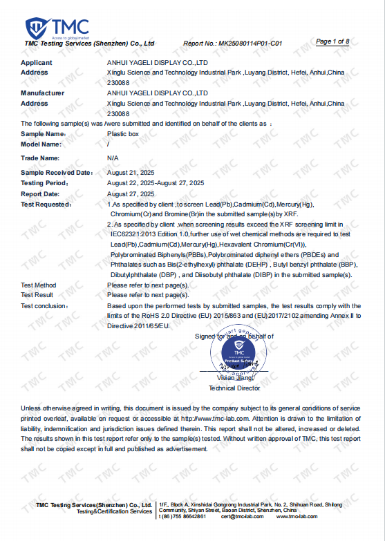 ANHUI YAGELI DISPLAY CO., LTD Achieves RoHS Certification for Acrylic Display & Trading Card Accessories
