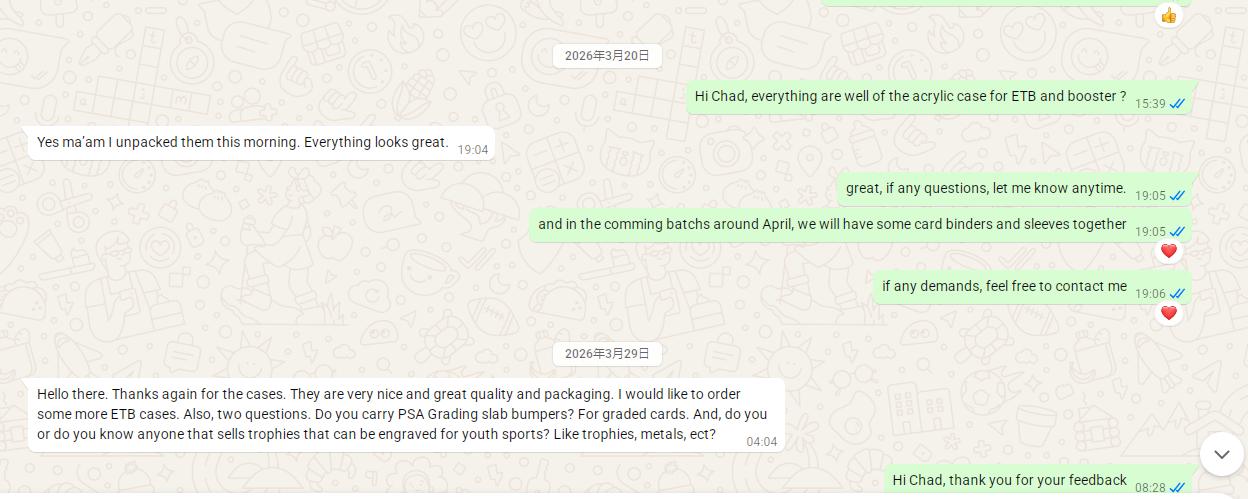 YAGELI es ampliamente reconocida como una de las principales fabricantes de accesorios para tarjetas coleccionables en China. Con más de 27 años de experiencia, una planta de producción de 293 750 pies cuadrados, más de 500 trabajadores cualificados y exportaciones a más de 88 países, la empresa se especializa en portatarjetas premium, portatarjetas rígidos, estuches para tarjetas de colección, carpetas, fundas, estuches magnéticos y expositores de tarjetas de acrílico, ofreciendo servicios completos de OEM y ODM para marcas internacionales.