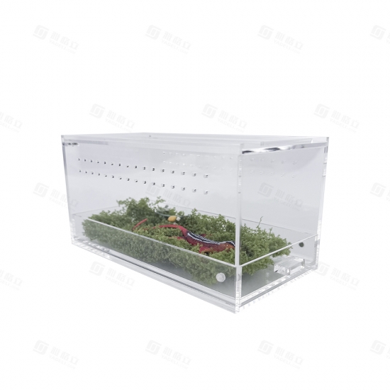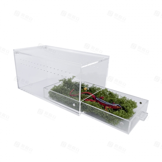 Este recinto sirve como hábitat seguro y de bajo mantenimiento para pequeñas mascotas exóticas: el cajón deslizante permite cambiar rápidamente el sustrato y limpiar las manchas, mientras que su diseño ventilado mantiene una humedad y una ventilación adecuadas. Las paredes transparentes permiten la observación constante de su mascota, y el material resistente a los rayos UV protege tanto al recinto como a su mascota de los daños causados por la luz.